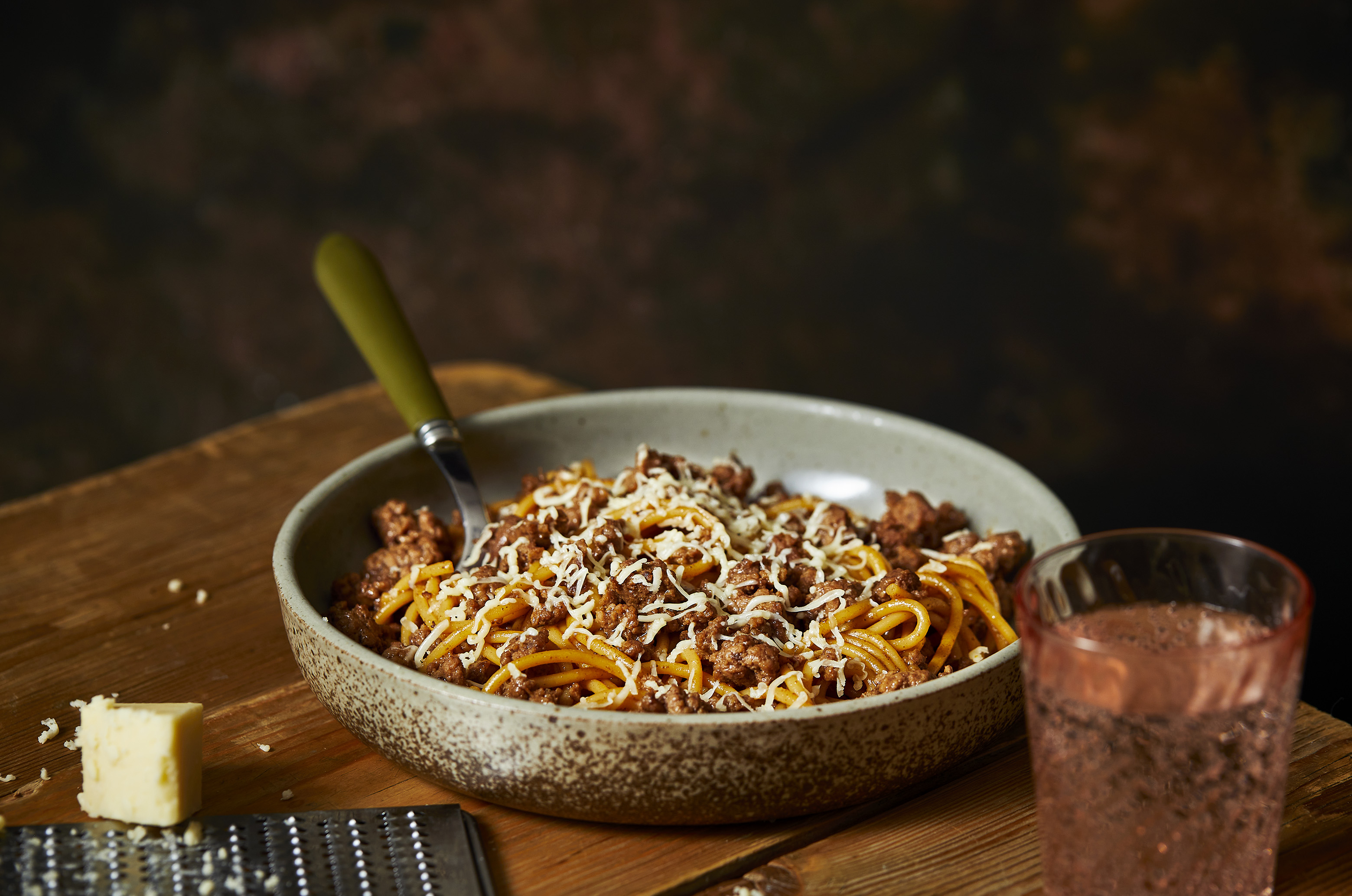 Add the pasta to the cooked mince and stir in the marmite. Add a glug of the reserved cooking water and stir the pasta well to make sure everything combines.