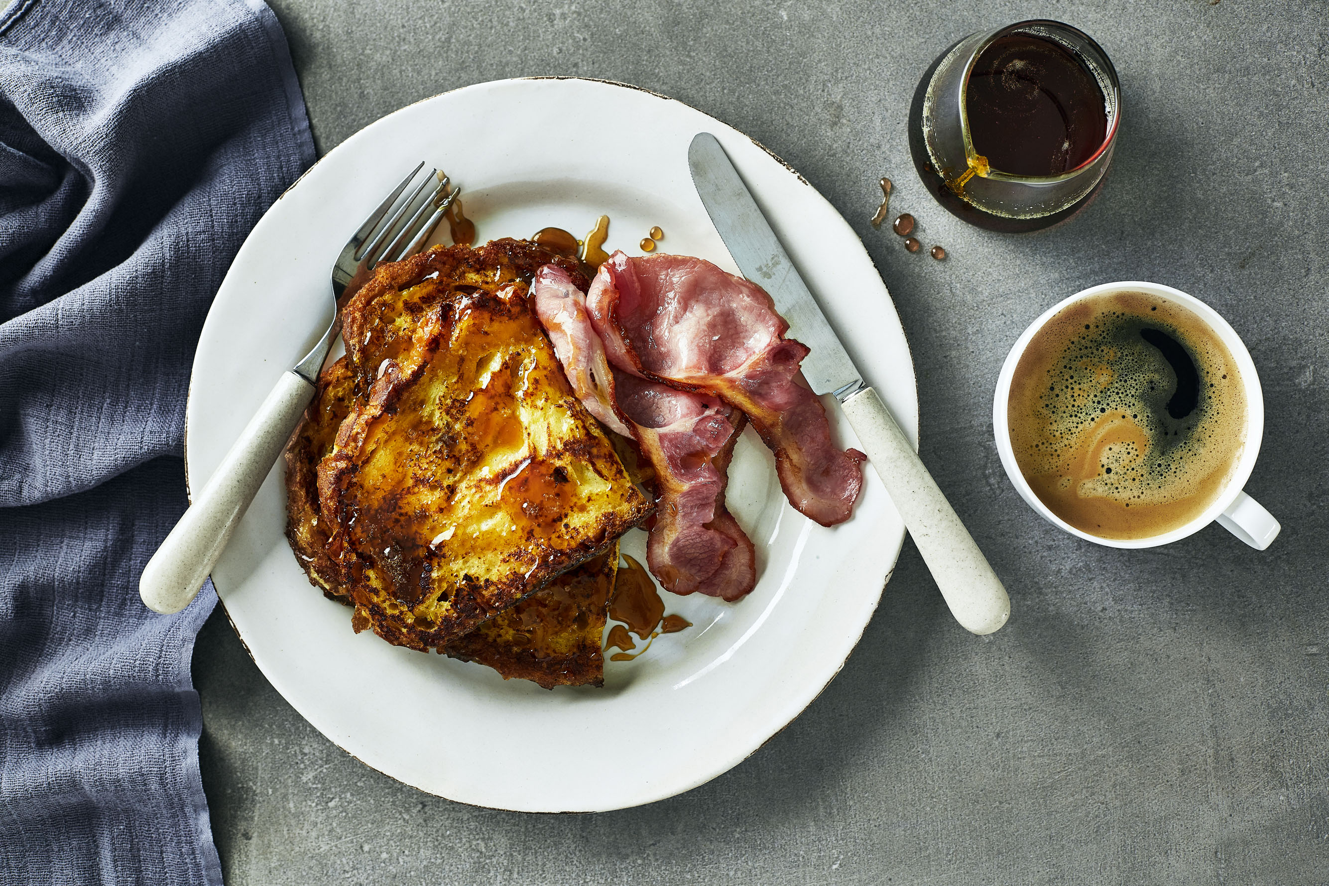 Heat the oil in a non-stick frying pan, add the soaked bread and fry for 2 minutes on each side, or until golden. Transfer to a plate, top with the bacon and drizzle over the maple syrup to serve.
