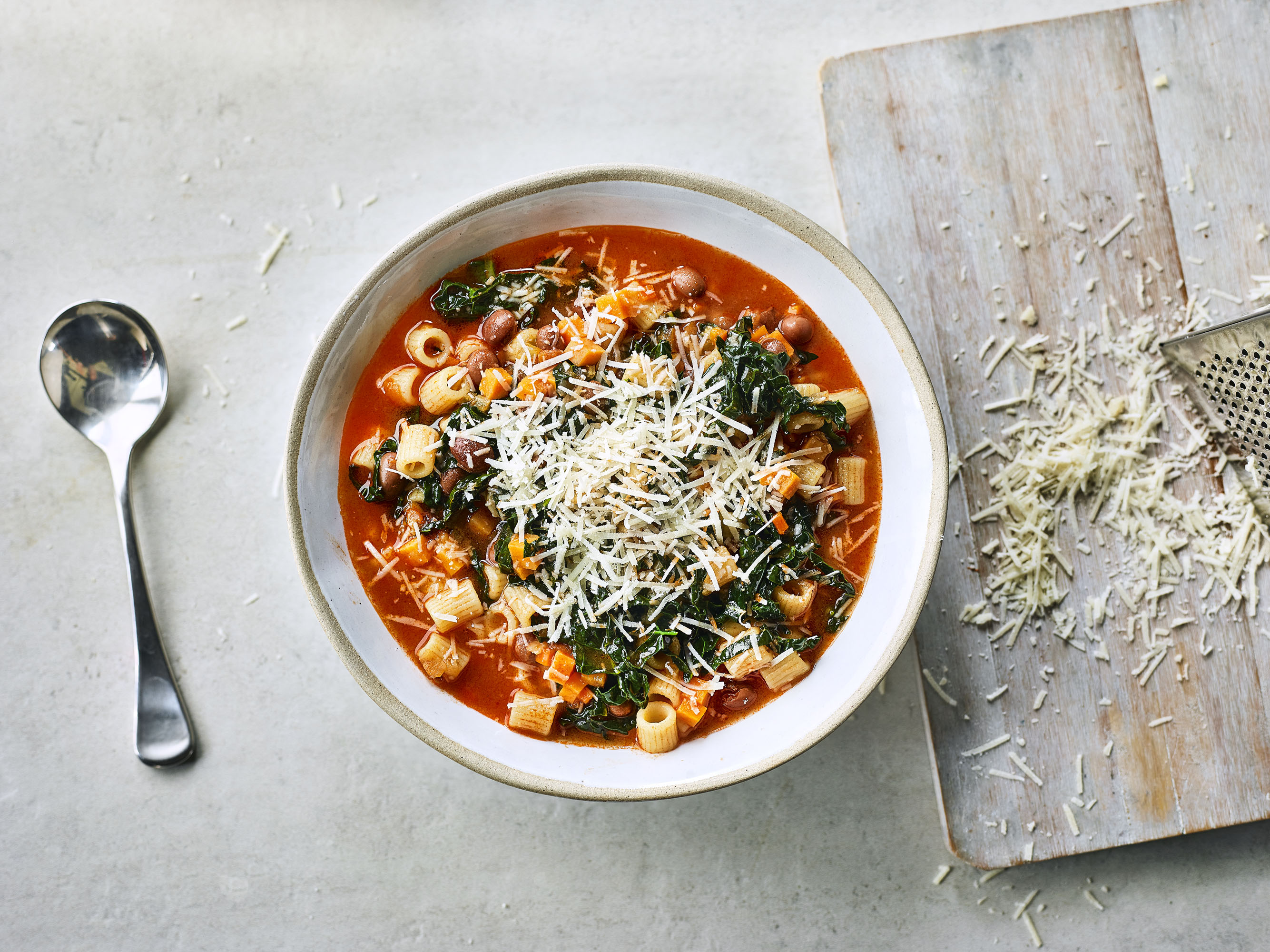Add the pasta and sweet potato and simmer for for 5 minutes. Add the beans and kale and cook for a further 3-4 minutes until the pasta and sweet potato are cooked through. Pour into a warmed soup bowl, scatter over the parmesan and serve.