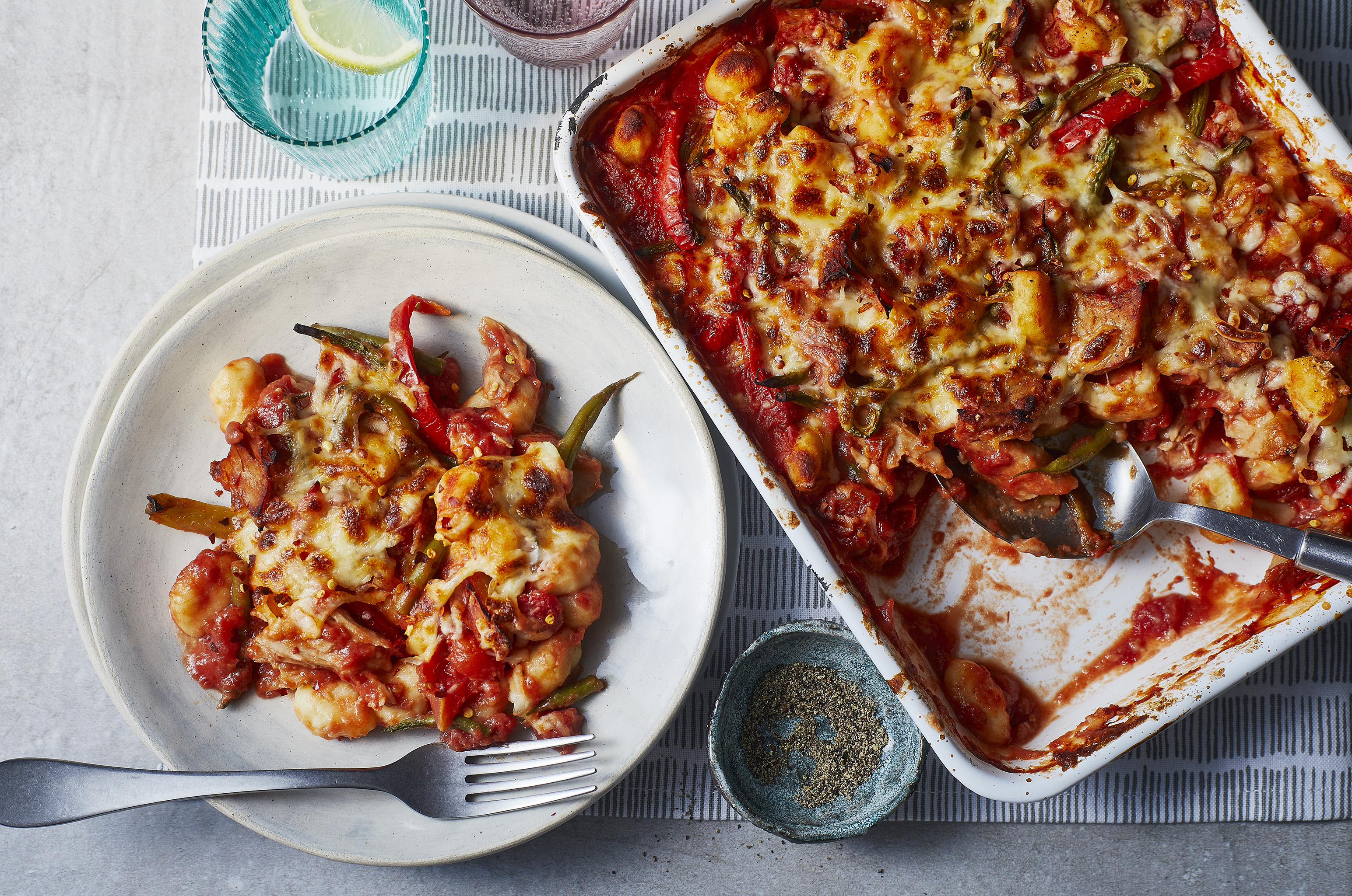 Heat the olive oil in a large frying pan, or hob safe baking tray, over a medium high heat and add the gnocchi and chicken pieces. Cook for a few minutes or so just to brown the outsides, then add in the chopped tomatoes, peppers and green beans.