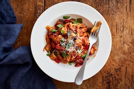 Heat the remaining oil in the pan, add the onion, pepper, courgette and aubergine and fry for 5 minutes until soft. Add the garlic, fry for a minute then add the tomatoes. Stir in the chicken, pasta and water, cover then simmer for 10 minutes until the pasta is cooked.