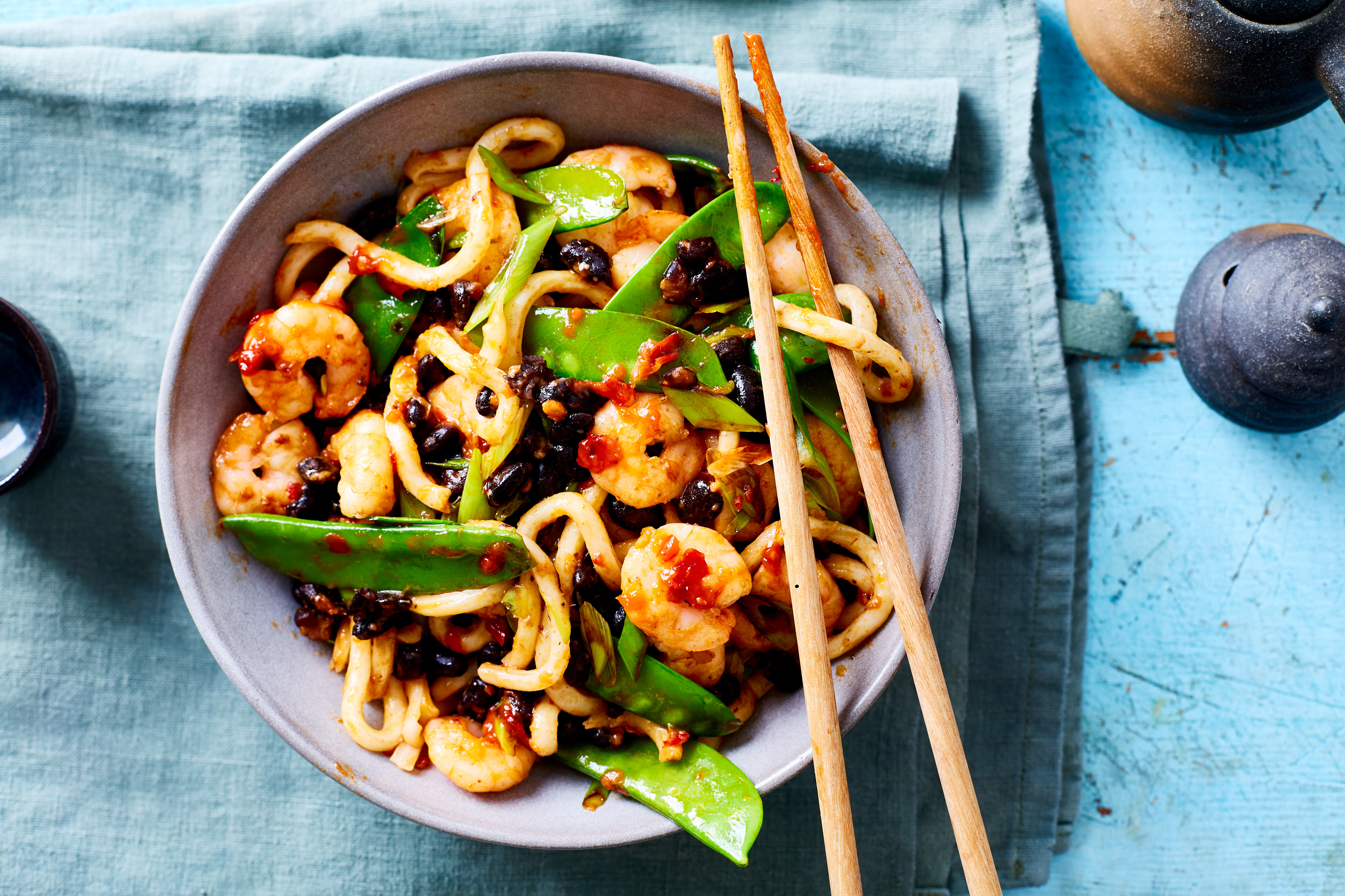 Set a wok over a high heat until smoking then add half of the oil. Add the prawns, ginger and garlic and stir fry for a couple of minutes until the prawns turn pink. Tip everything onto a plate then add the remaining oil to the wok. Add the mangetout, spring onions and noodles and fry for a couple of minutes. Stir in the black beans, chilli bean sauce and soy sauce then return the prawns to the wok and toss through the noodles. Transfer to a warm bowl and serve.