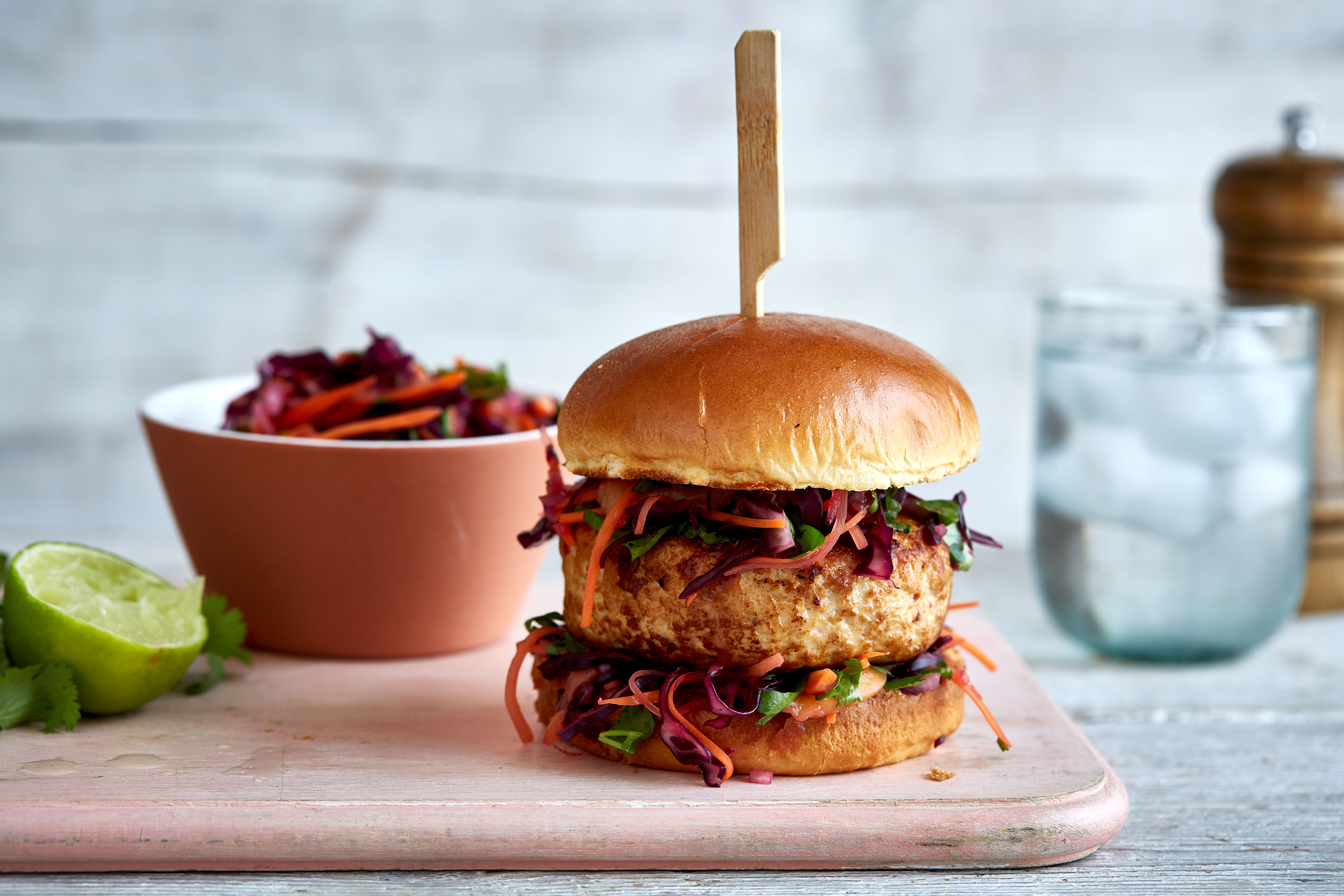 Layer the burger in the bun with some of the slaw and sandwich together. Serve with the extra slaw on the side.